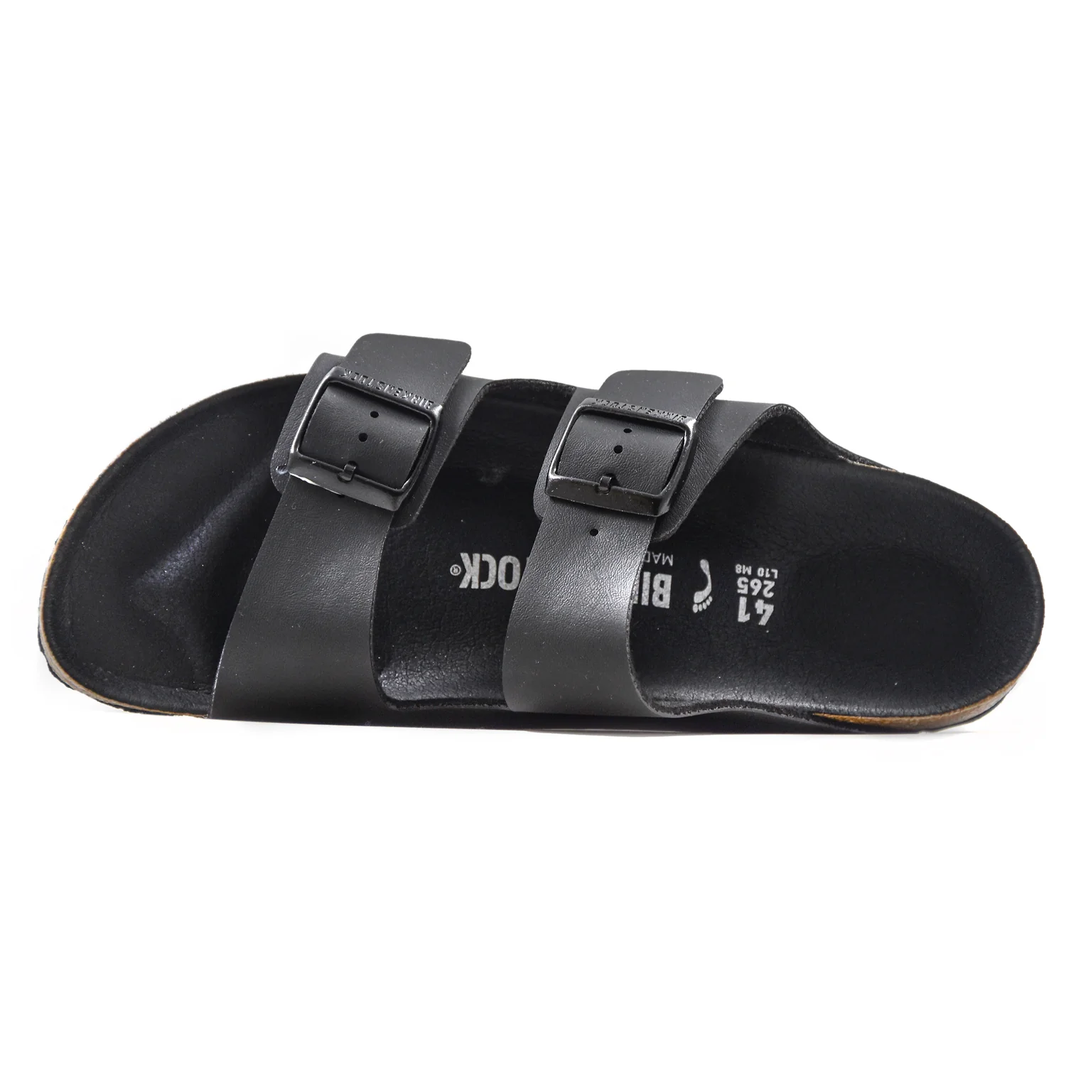 Sandalo Birkenstock da uomo Made in Germany, modello Arizona in ecopelle nera con due fasce frontali regolabili da fibbie.